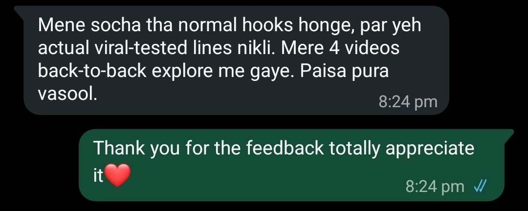 1000 high-performing viral hooks curated from real content that blew up across social platforms. Each hook is paired with an example reel that used it successfully, giving you clear insight into why it worked, how it grabbed attention, and how to recreate the viral effect in your own content. This bundle is designed to help you master the art of hooking viewers instantly.
